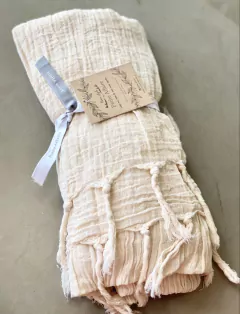 Camino de gasa en color crudo , con flecos en los frentes, lo que le da un aspecto muy casual y relajado.
